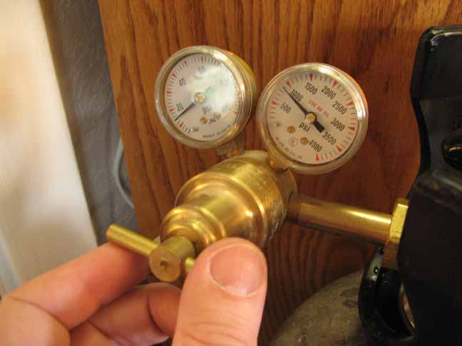 Turning on the Gas and Adjusting the Pressure You get the gas to flow and set the output pressure with the adjusting screw, which is usually a rod-shaped handle set on a screw between the gauges.